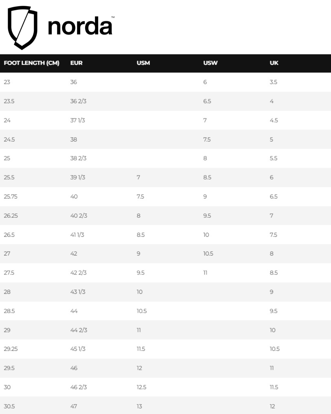 Norda Size Chart